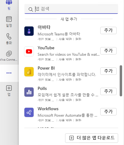 이런식으로 앱이나 ..버튼을 누르면 다양한 팀즈 안에 App 들을 쓸 수 있습니다.