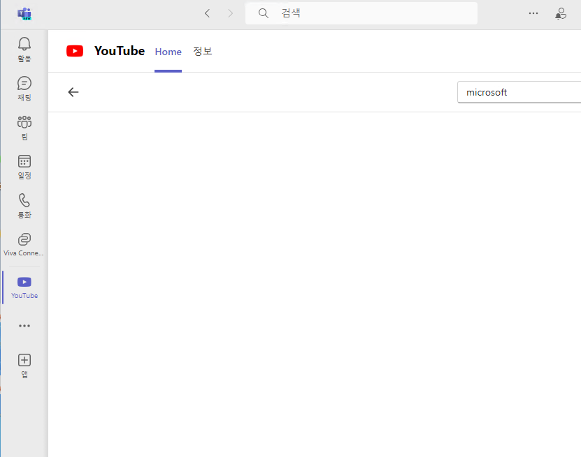 저기서 유투브 앱을 추가하면 팀즈에서 유투브를 쓸 수 있습나다..그런데 회사에서 네트워크 막아놓으면 아래 이미지처럼 아무것도 안나오게 됩니다.