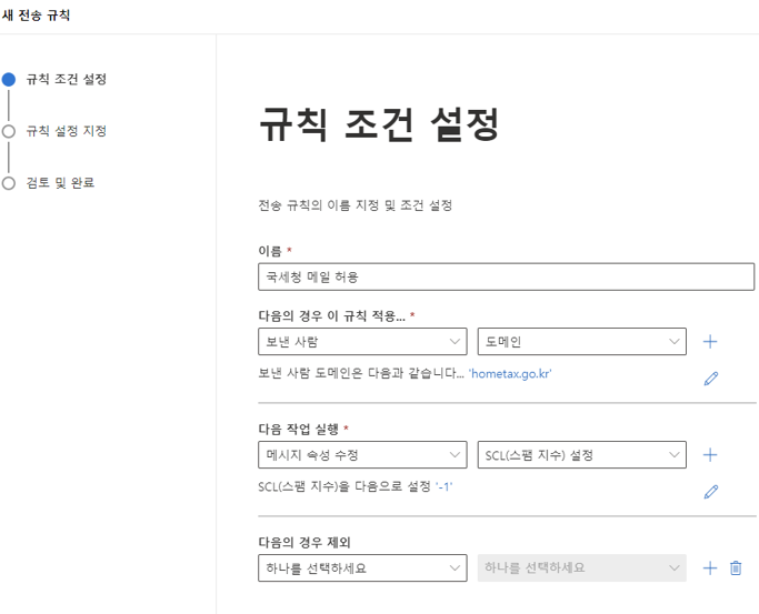발송 서버의 시스템에 따라 약간씩 규칙은 다르게 설정해야 하며 간혹 스팸지수(SCL)를 1로 설정해야 하는 경우도 있습니다.
