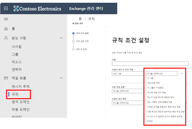 메일흐름 > 규칙 > 새 규칙 만들기를 통해서 원하는 데로 설정하실 수 있습니다.