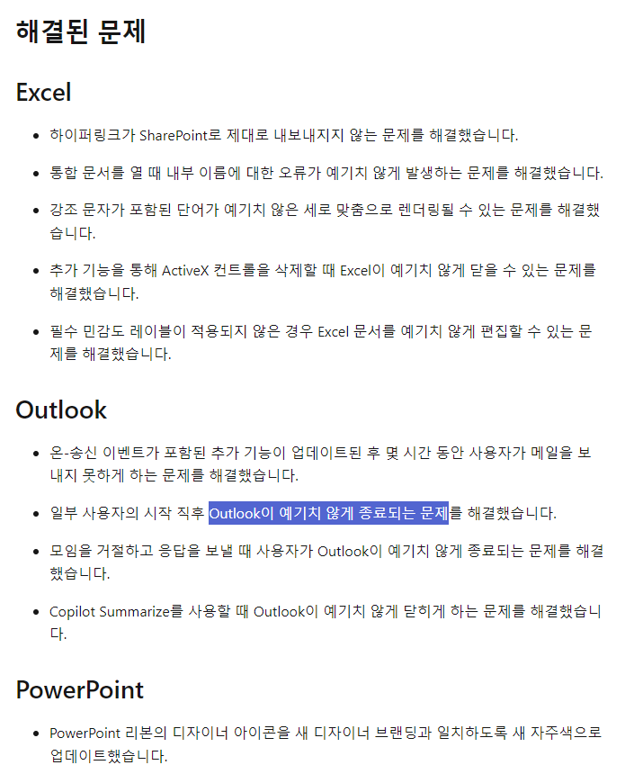 아래 버전으로 패치되면서 수정되었기 때문에 2403~2405 버전이라면 아웃룩에 문제가 있어서 멈췄다고 보셔도 됩니다.