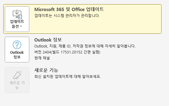 버전은 아웃룩 왼쪽상단 파일 > Office 계정 > Outlook 정보를 통해서 확인하실 수 있습니다.