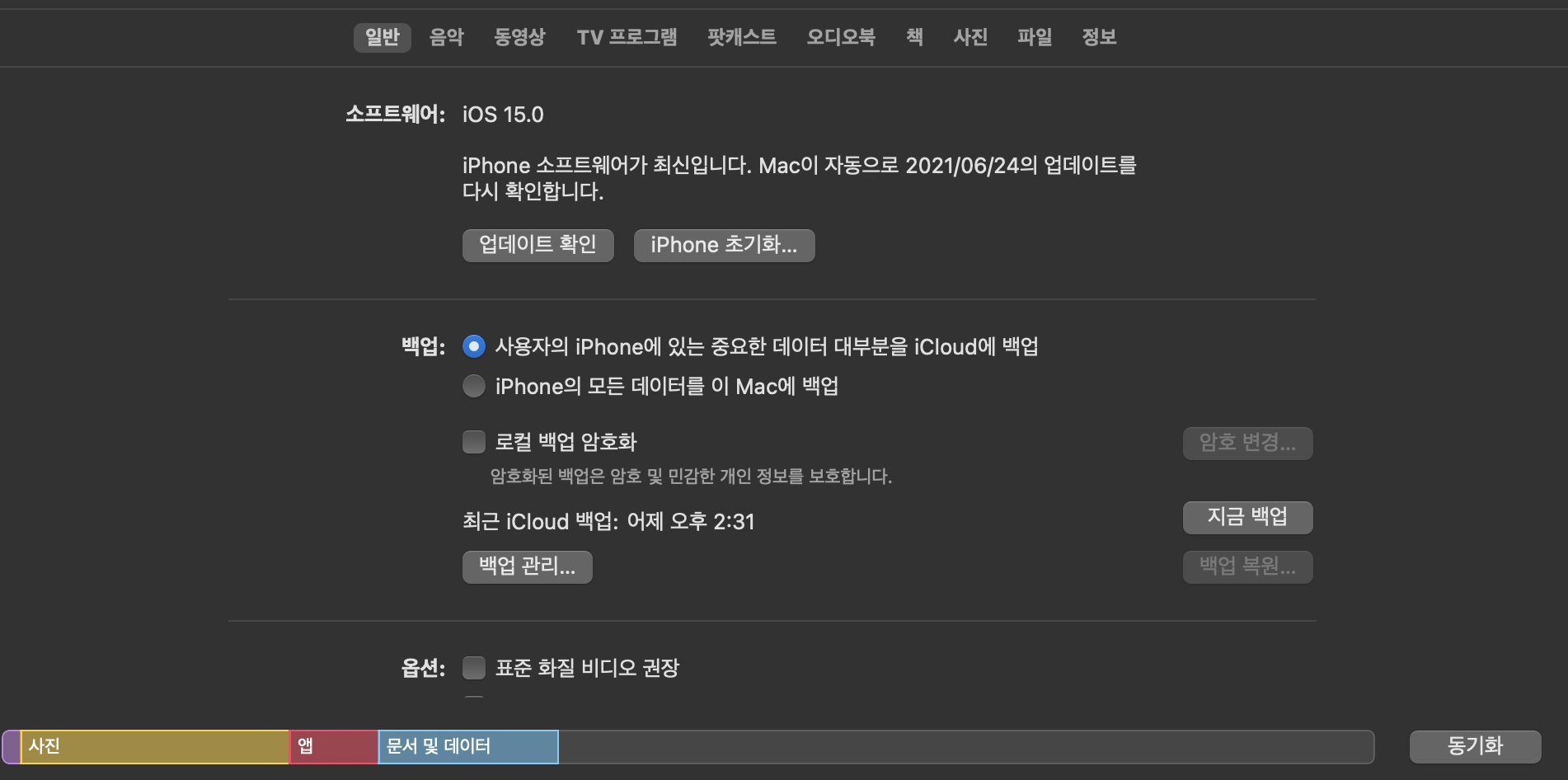 최신버전 mac os(11이상) 에서 아이폰 초기화