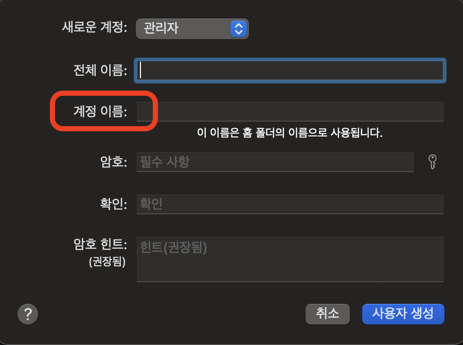 다만아래 이름으로 폴더나 경로가 생성되기 때문에 한 번 정한 계정 이름은 바꾸지 마세요